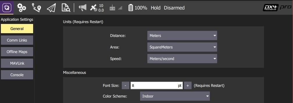 The Settings View is used to configure the settings for the QGroundControl application (rather than a specific vehicle). You do not have to have a vehicle connected to change these values.