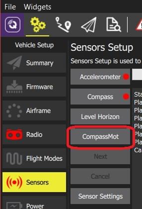 The Sensor Setup section allows you to configure and calibrate the vehicle's compass, gyroscope, accelerometer and any other sensors (the available sensors will depend on the vehicle type).